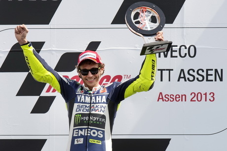 Rossi finis terdepan dalam balapan di Sirkuit Assen, Sabtu (29/6/2013) malam WIB. Rider Yamaha itu menuntaskan lomba sepanjang 26 lap dalam waktu 41 menit 25,202 detik.